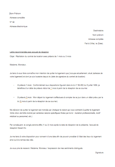 Appartement Modele Lettre De Resiliation - Modèle de résiliation bail commercial.. Lorsque vous êtes locataire, dès que vous souhaitez quitter votre logement, vous devez en faire part au propriétaire bailleur. Titulaire du bail de location signé le (date) portant sur le logement situé (adresse), je vous informe de mon congé qui prendra effet le (date), soit trois mois après la réception de cette lettre recommandée. Nos modèles de lettres sont entièrement gratuits et mis à jour régulièrement par nos juristes. C'est pourquoi nous avons concocté rien que pour vous, un modèle de lettre de résiliation de bail que vous n'avez plus qu'à compléter. Cette lettre doit revêtir une certaine forme.